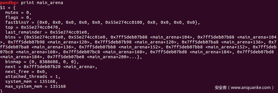 利用__malloc_hook-0x23的0x7f来使用fastbin dup控制红框中的内容,往红框里面写入0x70,再进行一次fastbin attack就可以控制指向top chunk的指针,这里0x55e274cc0470就是topchunk的地址。红框内是fastbin数组,可以利用这个进行二次fastbin attack。