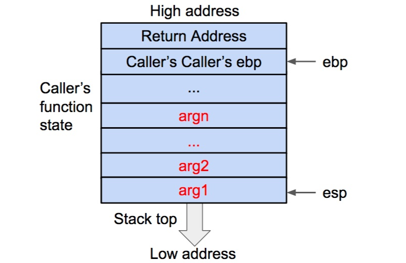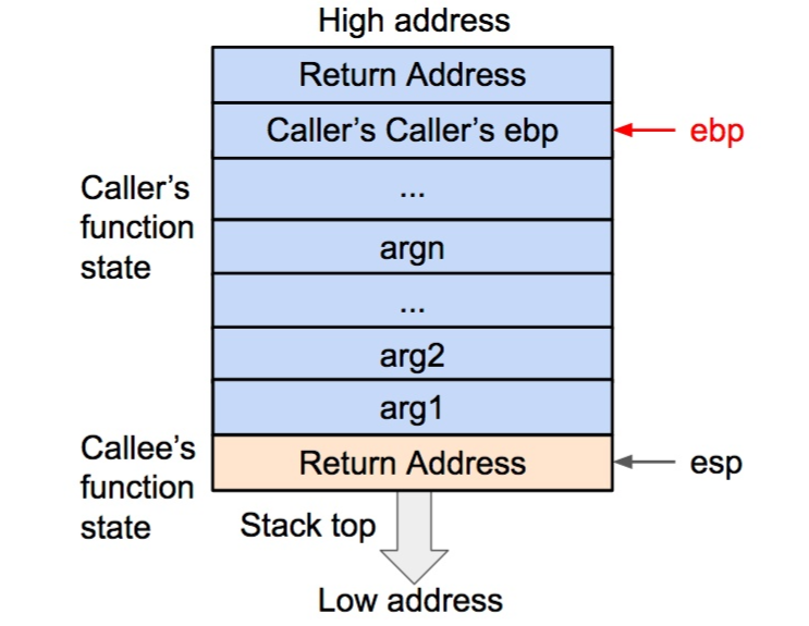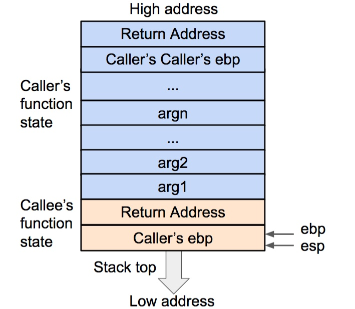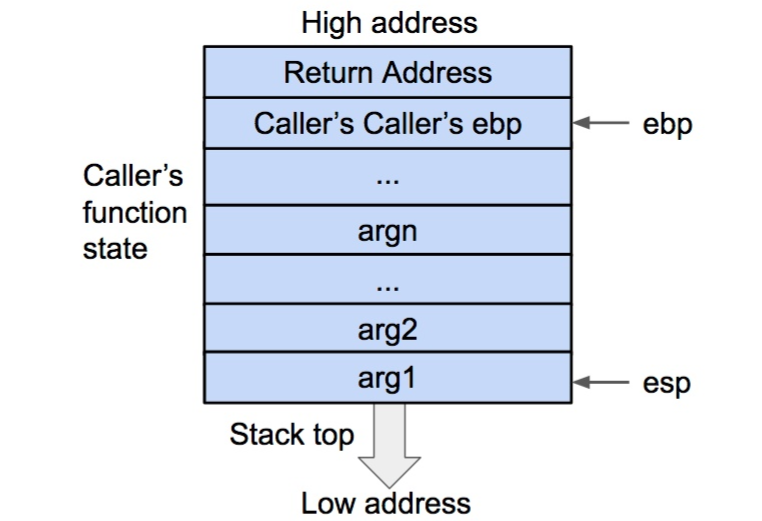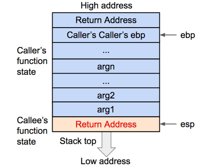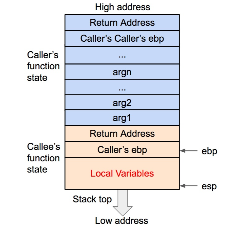 在压栈的过程中,esp 寄存器的值不断减小(对应于栈从内存高地址向低地址生长)。压入栈内的数据包括调用参数、返回地址、调用函数的基地址,以及局部变量,其中调用参数以外的数据共同构成了被调用函数(callee)的状态。在发生调用时,程序还会将被调用函数(callee)的指令地址存到 eip 寄存器内,这样程序就可以依次执行被调用函数的指令了。
