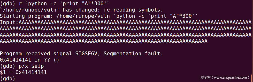 以Python命令运行,输入300个A,结果如图,p查看寄存器,/x以十六进制,看到指令寄存器已经被AAAA覆盖,确定覆盖返回地址是可能的。
