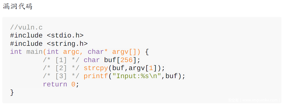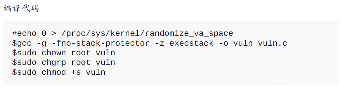编译代码第一行,表示关闭ASLR(地址空间布局随机化)。kernel.randomize_va_space堆栈地址随机初始化,很好理解,就是在每次将程序加载到内存时,进程地址空间的堆栈起始地址都不一样,动态变化,导致猜测或找出地址来执行shellcode 变得非常困难。