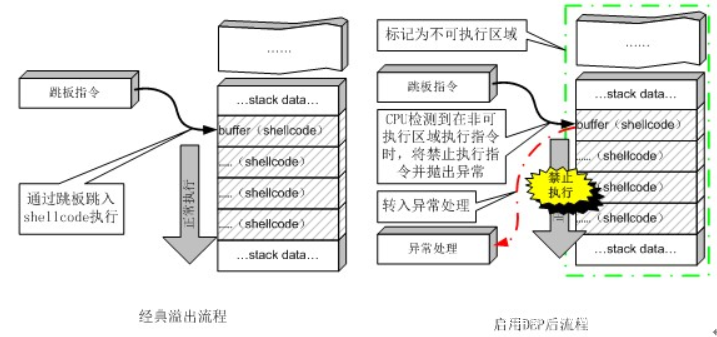 NX即No-execute(不可执行)的意思,NX(DEP)的基本原理是将数据所在内存页标识为不可执行,当程序溢出成功转入shellcode时,程序会尝试在数据页面上执行指令,此时CPU就会抛出异常,而不是去执行恶意指令。