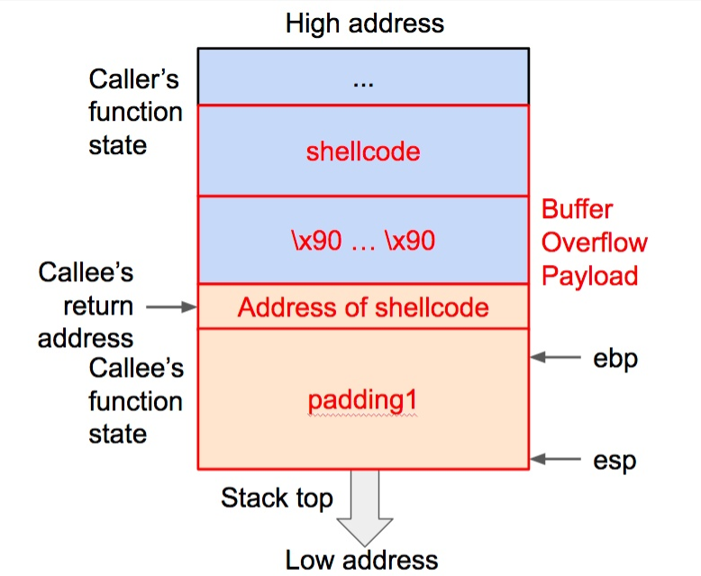 我们可以在调试工具里查看返回地址的位置(可以查看 ebp 的内容然后再加4(32位机),参见前面关于函数状态的解释),可是在调试工具里的这个地址和正常运行时并不一致,这是运行时环境变量等因素有所不同造成的。所以这种情况下我们只能得到大致但不确切的 shellcode 起始地址,解决办法是在 padding2 里填充若干长度的 “x90”。这个机器码对应的指令是 NOP (No Operation),也就是告诉 CPU 什么也不做,然后跳到下一条指令。有了这一段 NOP 的填充,只要返回地址能够命中这一段中的任意位置,都可以无副作用地跳转到 shellcode 的起始处,所以这种方法被称为 NOP Sled(中文含义是“滑雪橇”)。这样我们就可以通过增加 NOP 填充来配合试验 shellcode 起始地址。