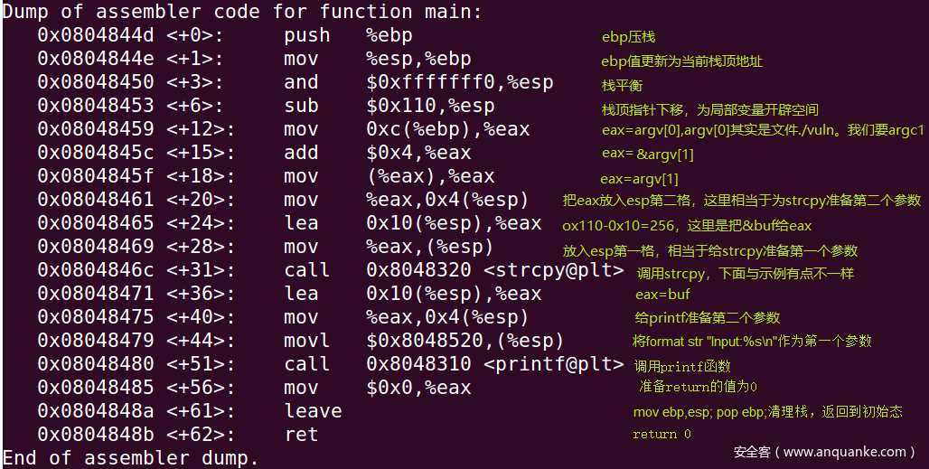 前七句,为开始的初始化,第八到第十句为strcpy准备参数,第十一句调用strcpy函数,第十二到十四句为printf准备参数,第十五句调用printf函数,后面就是清理栈和return的收尾3环节