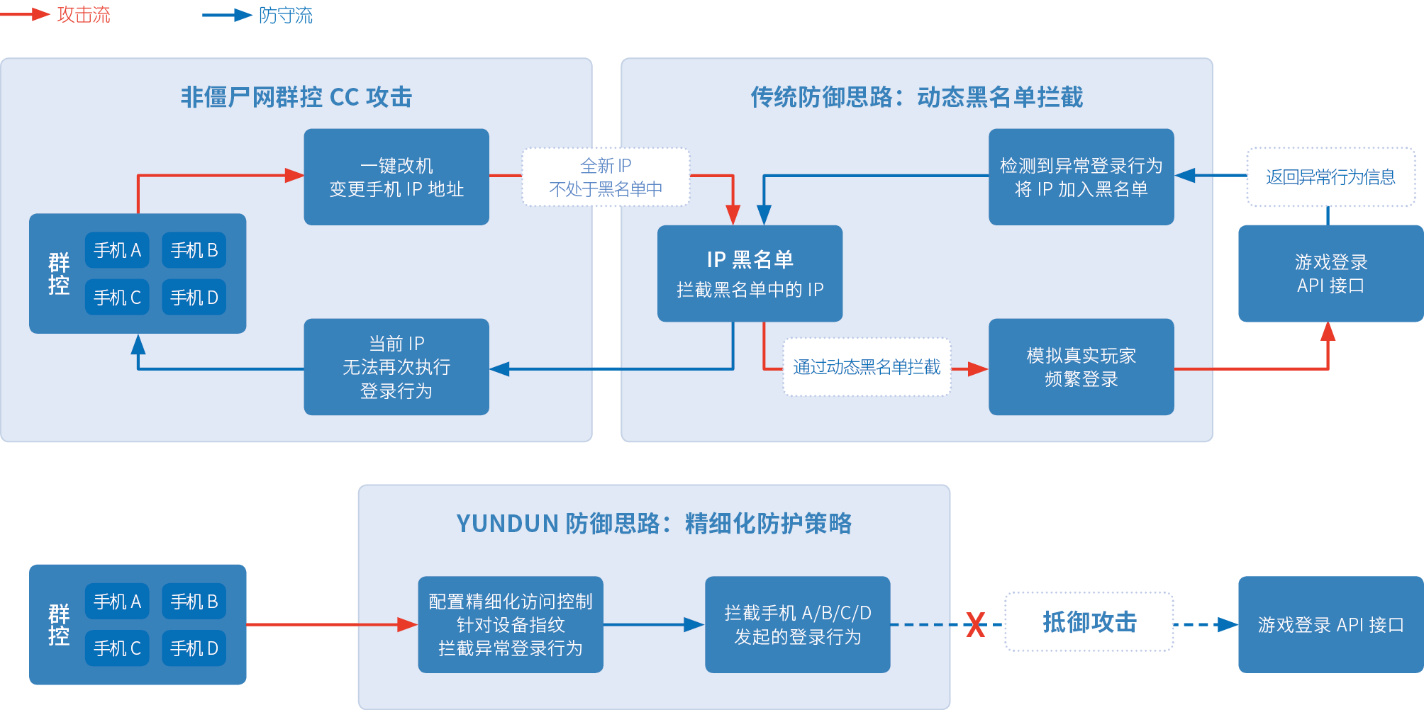 针对App场景,借助非僵尸网群控技术模拟真实用户访问行为,绕过传统动态黑名单拦截的防御模式,实施针对性CC攻击;