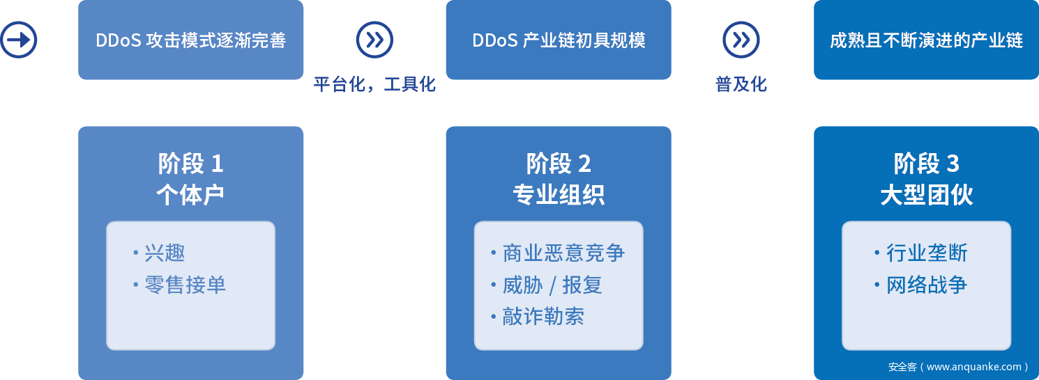 同时出现集成自动化的DDoS攻击软件、平台化的SaaS服务。且逐渐团伙化发展,形成DDoS完整攻击链闭环。