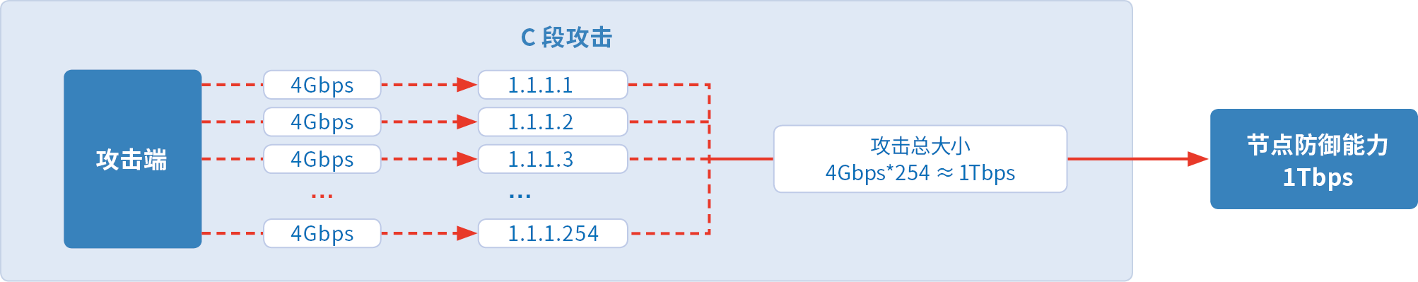 针对属于同一网段的单个IP进行小流量的DDoS攻击,绕过单IP的黑洞封禁策略,实现针对整体IP段流量压制,最终封堵整个节点带宽。