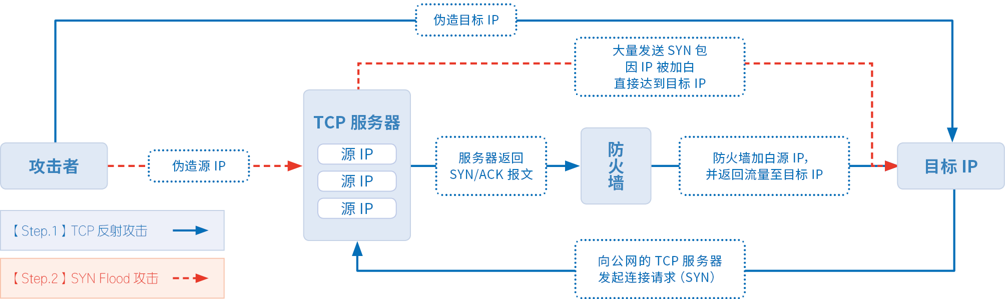 结合TCP反射攻击可以将反射服务器IP加入DDoS防火墙白名单的特性,绕过防守后,伪装反射服务器IP,发起大规模SYN Flood攻击,直击后端服务器;