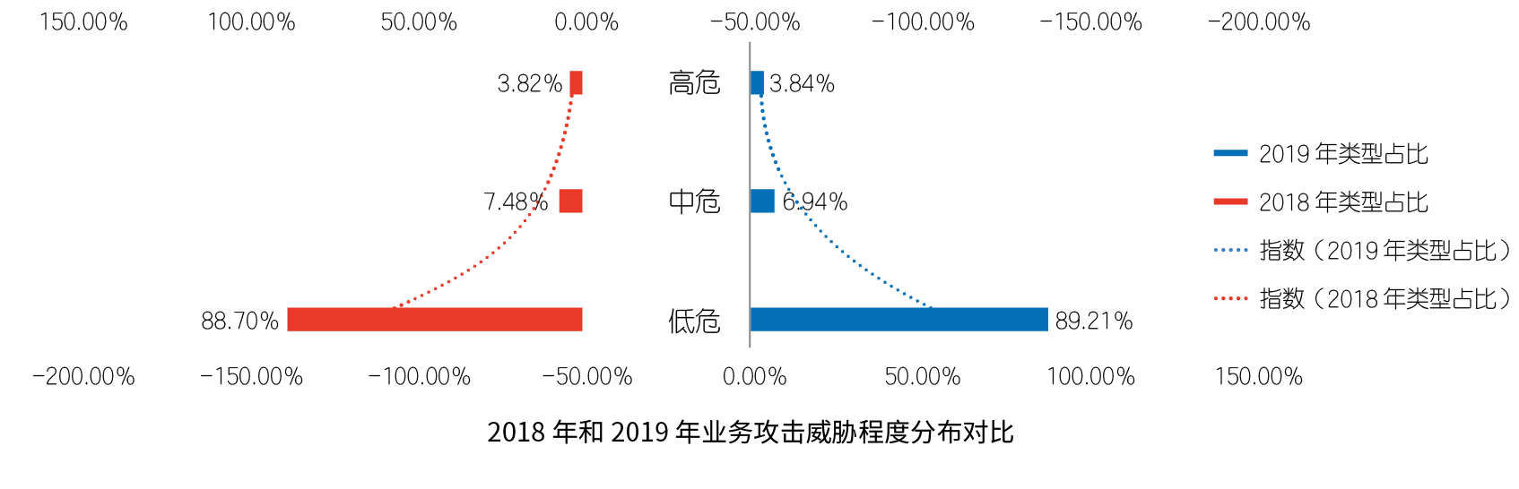 对于影响程度,2019年业务攻击威胁程度分布与2018年分布相似,业务层威胁两极化。