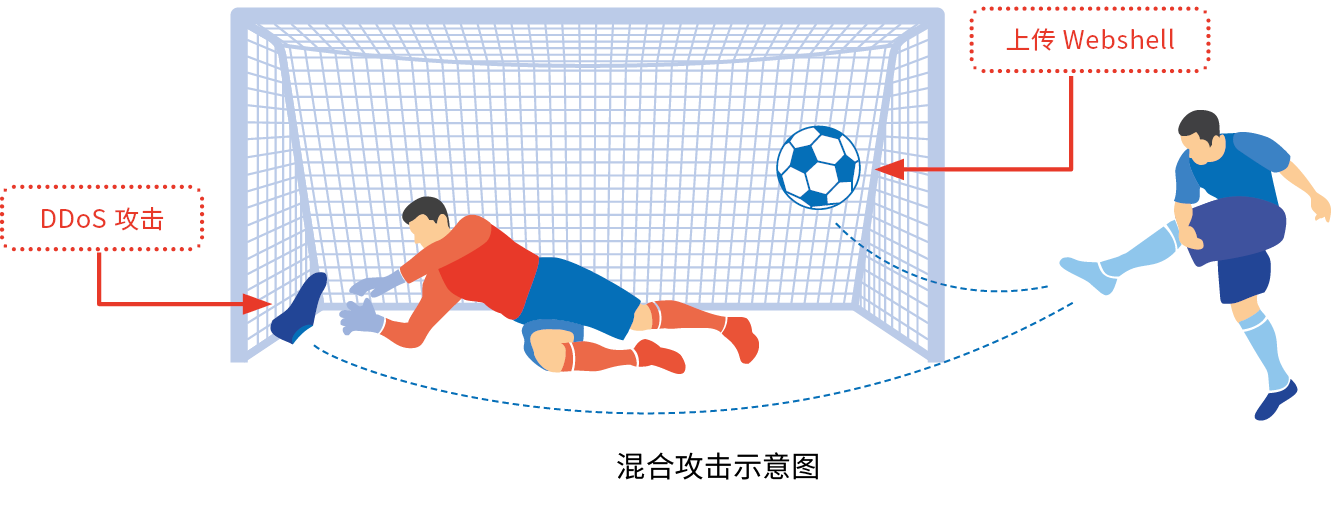 Web应用攻击+DDoS攻击的组合,让防御方疲于应对DDoS攻击,使Web应用攻击绕过防守主力,达到最终的攻击目的;