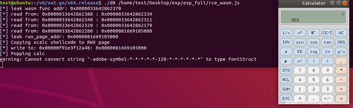 题目原材料中给了一个对应的Chrome程序,写一个index.html脚本调用上述rce_wasm.js文件,以—no-sandbox模式启动该Chrome,打开index.html,即可在Chrome中实现代码执行: