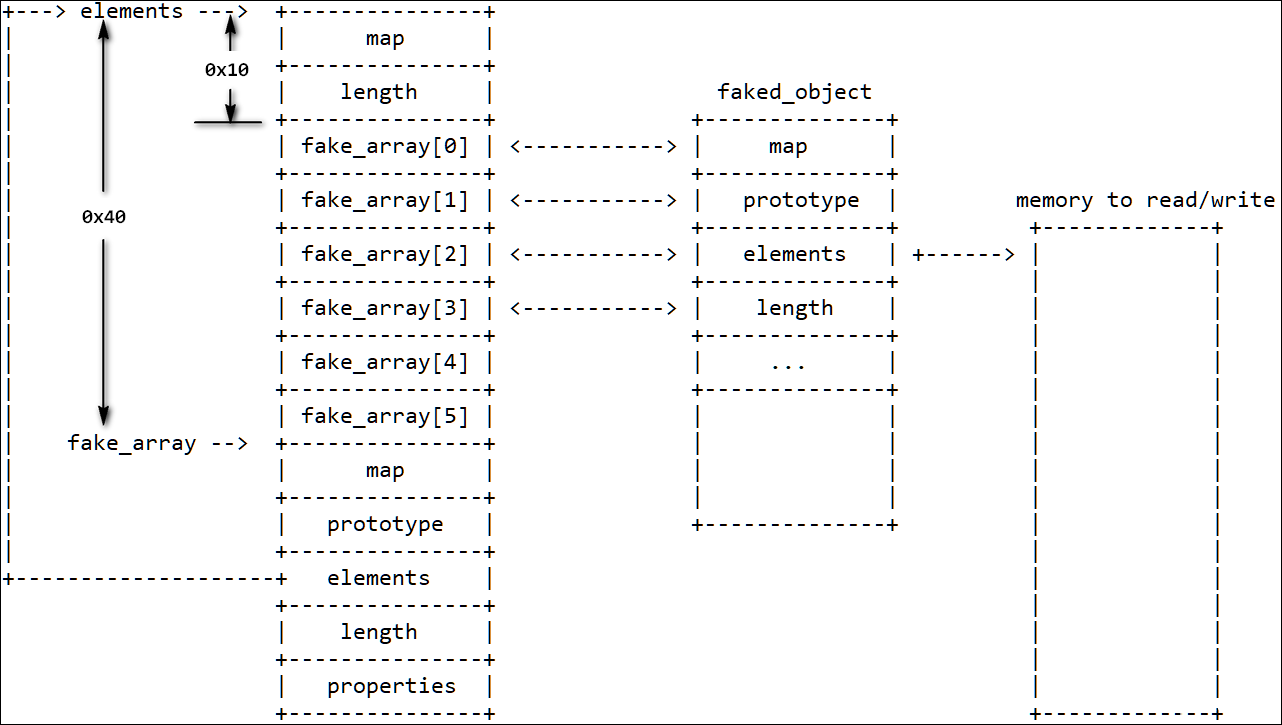这部分请参考《从一道CTF题零基础学V8漏洞利用》这篇文章,里面已经分析得很详细,本文从略。从diff文件中我们可以看到打完补丁的v8源码中存在一个off by one问题,可以在此基础上实现越界读/写,继而实现类型混淆。