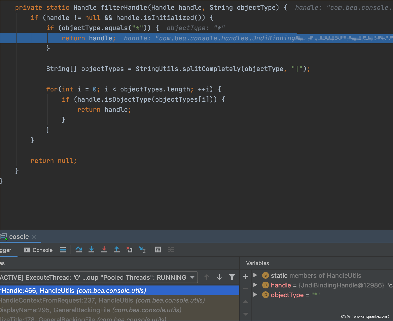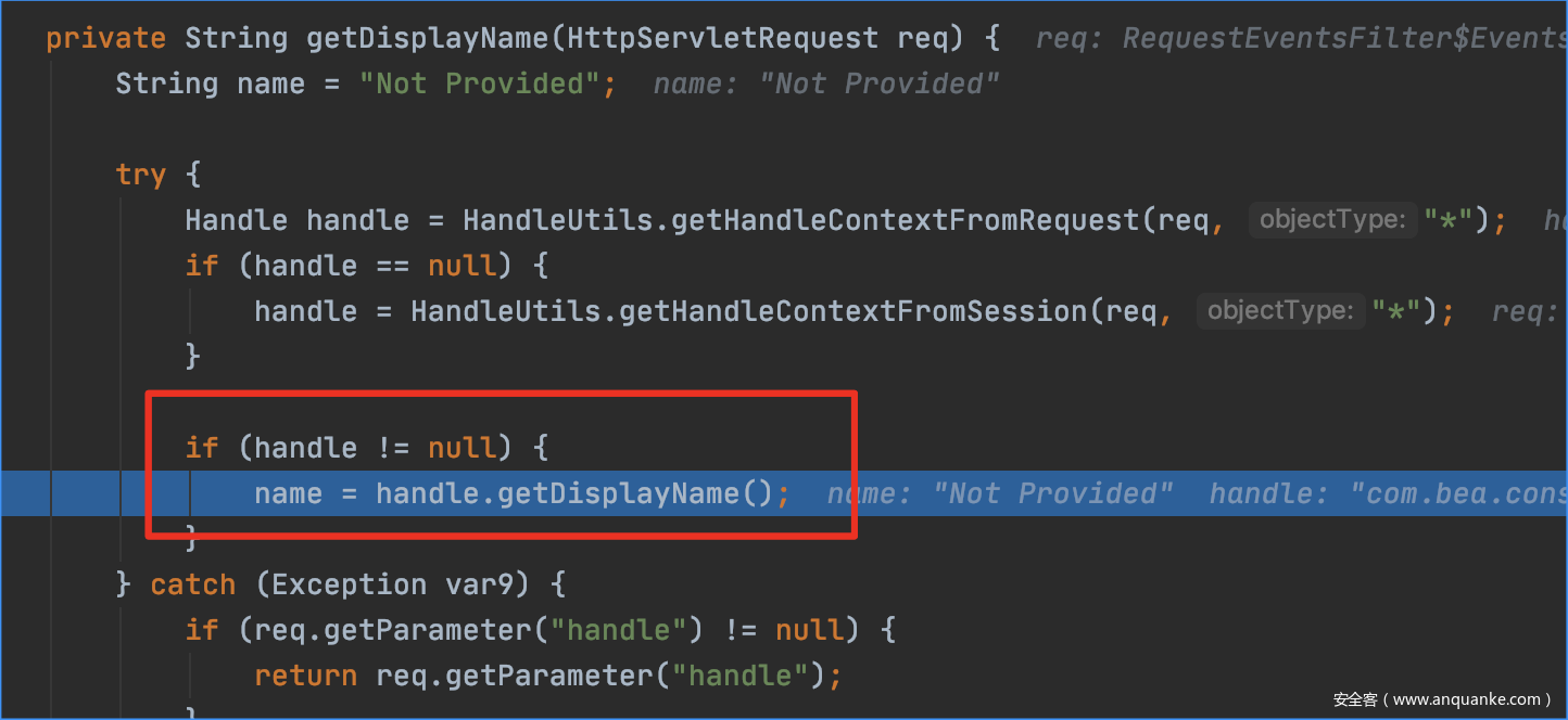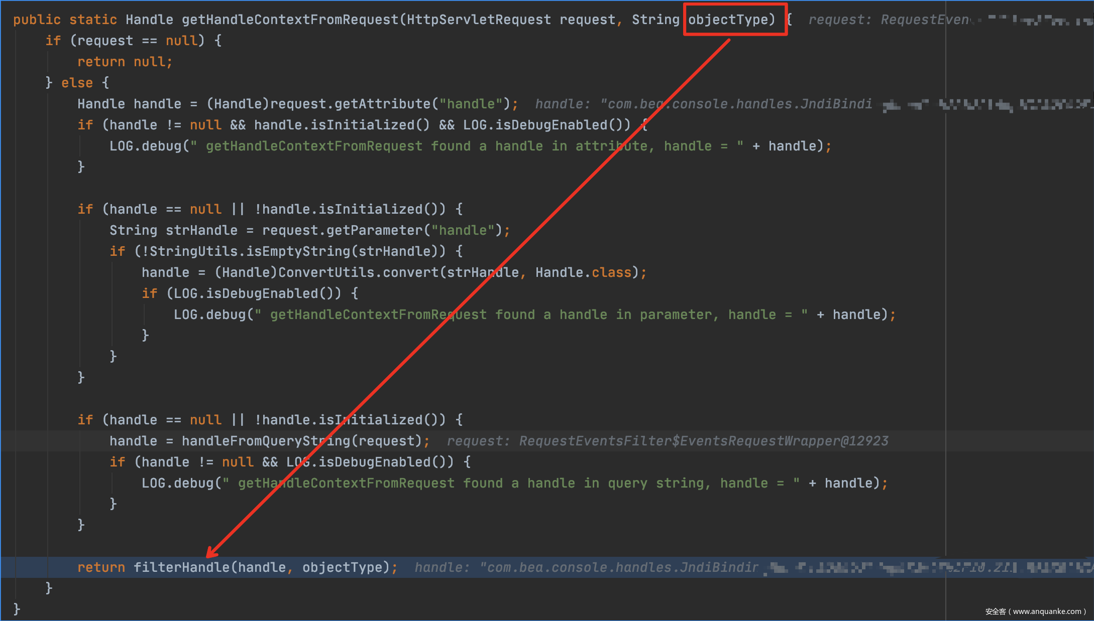 每个handle都有类型,但是这里objectType 不是null 且 handle被实例化所以这里其实是没做过滤的,我们的JNDIBindingPortlethandle的值就被存进handle了。所以这个方法中就可以在为handle结尾的key中传入任意的值。