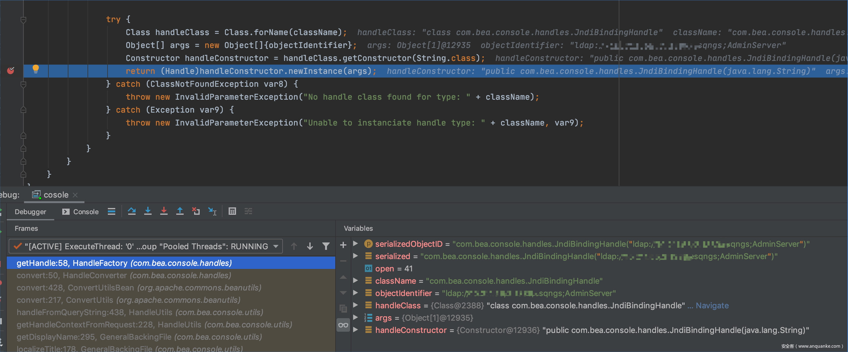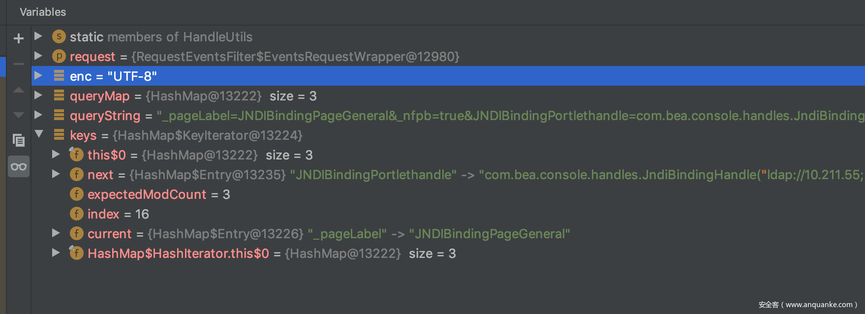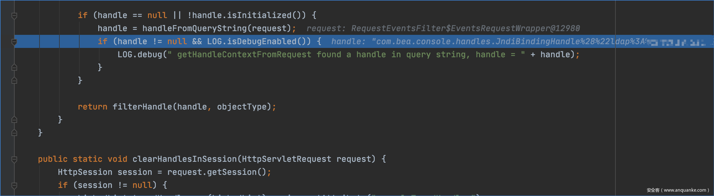 每个handle都有类型,但是这里objectType 不是null 且 handle被实例化所以这里其实是没做过滤的,我们的JNDIBindingPortlethandle的值就被存进handle了。所以这个方法中就可以在为handle结尾的key中传入任意的值。