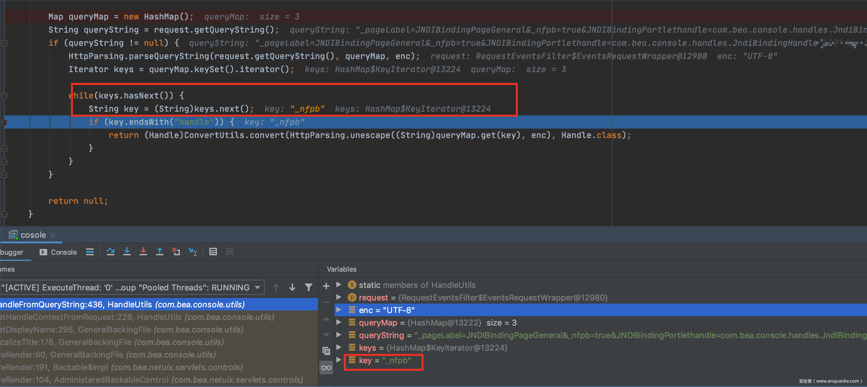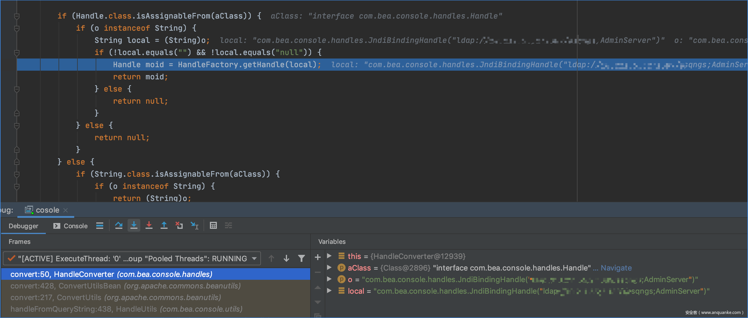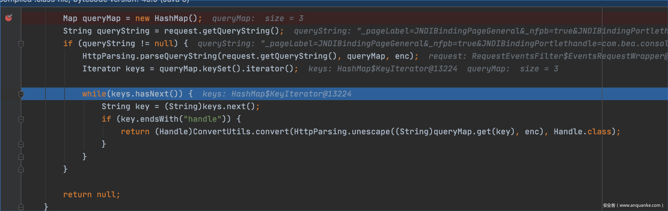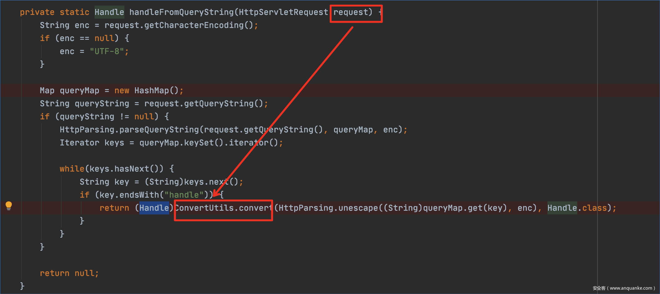 往下走,这里根据request请求的参数生产handle对象,通过(Handle)ConvertUtils.convert(HttpParsing.unescape((String)queryMap.get(key), enc), Handle.class);