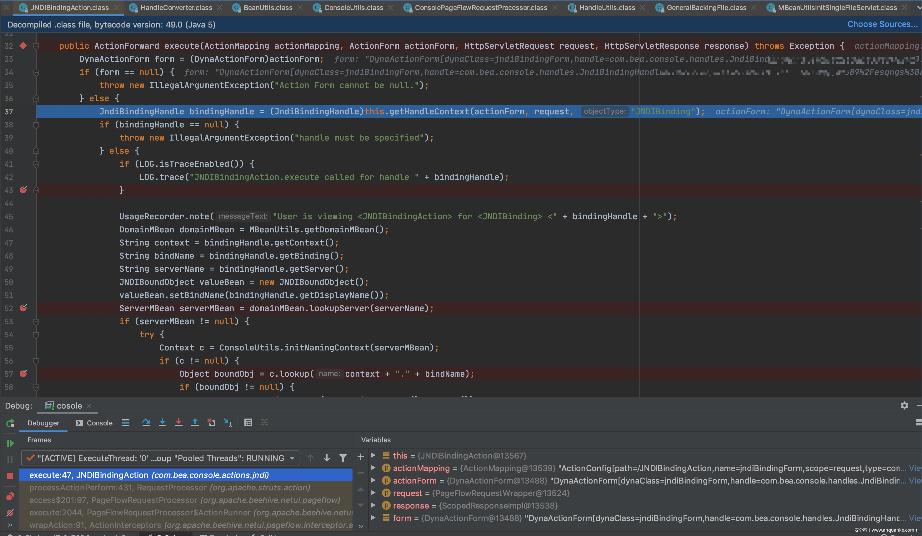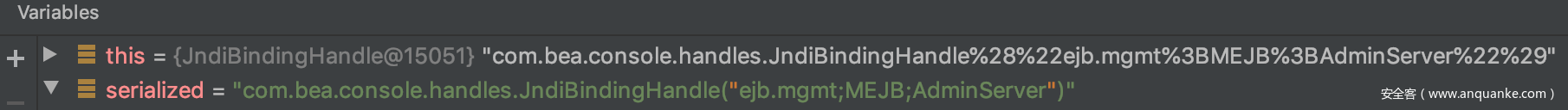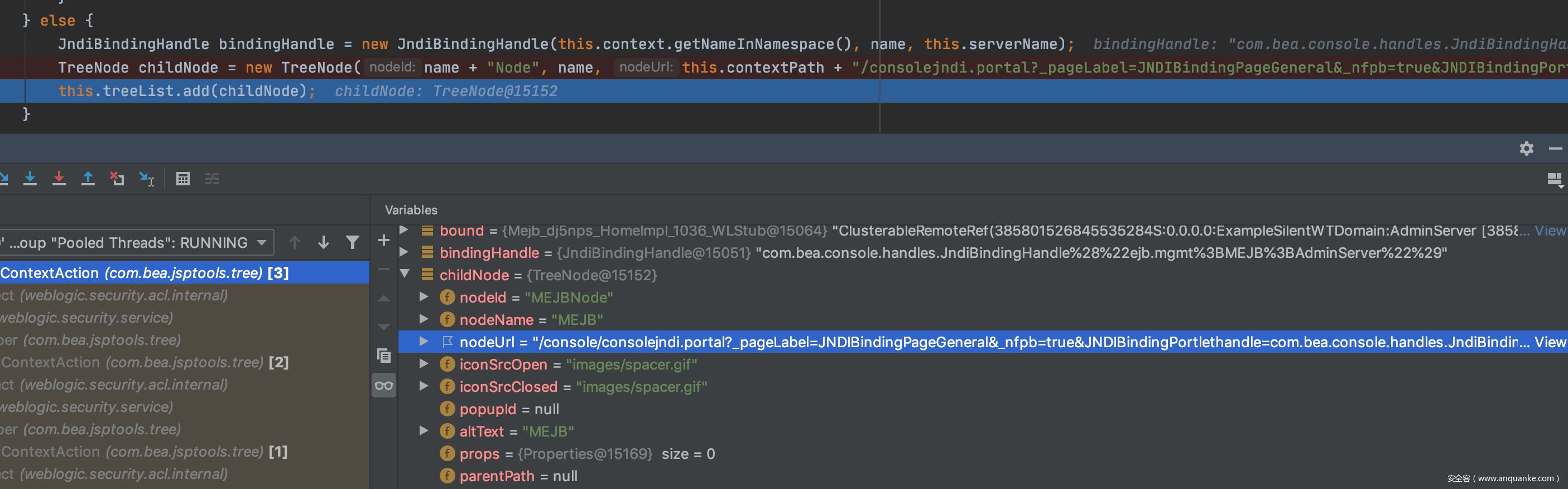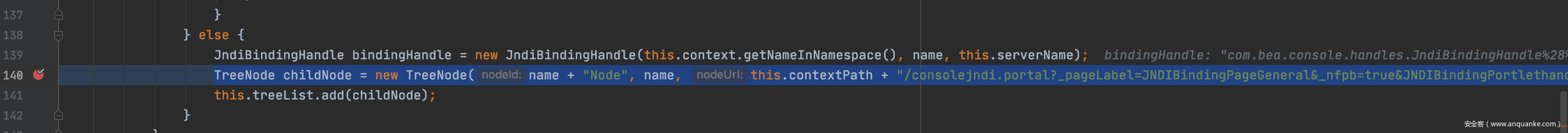 进入上面提到的lookup函数后,有一个run方法,其中TreeNode childNode = new TreeNode(name + “Node”, name, this.contextPath + “/consolejndi.portal?_pageLabel=JNDIBindingPageGeneral&_nfpb=true&JNDIBindingPortlethandle=” + bindingHandle, root);