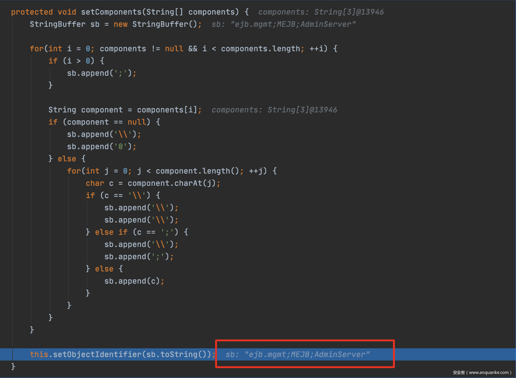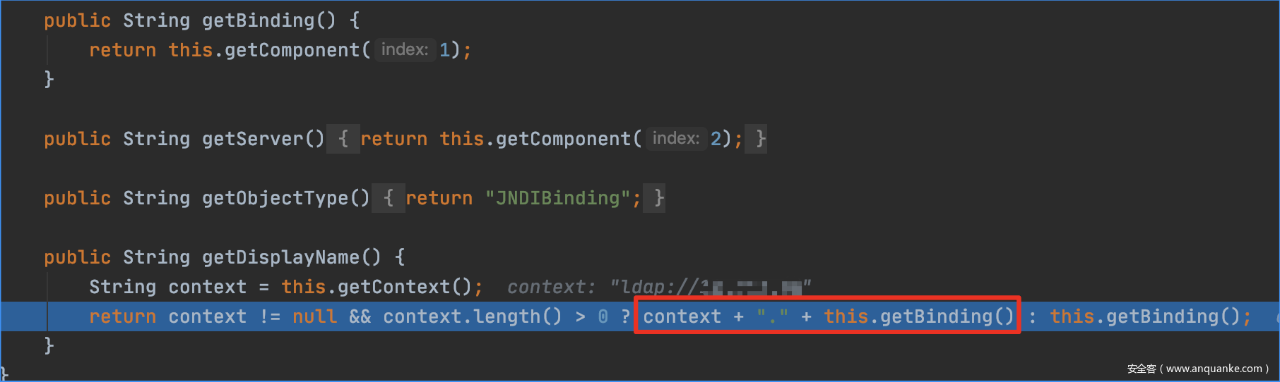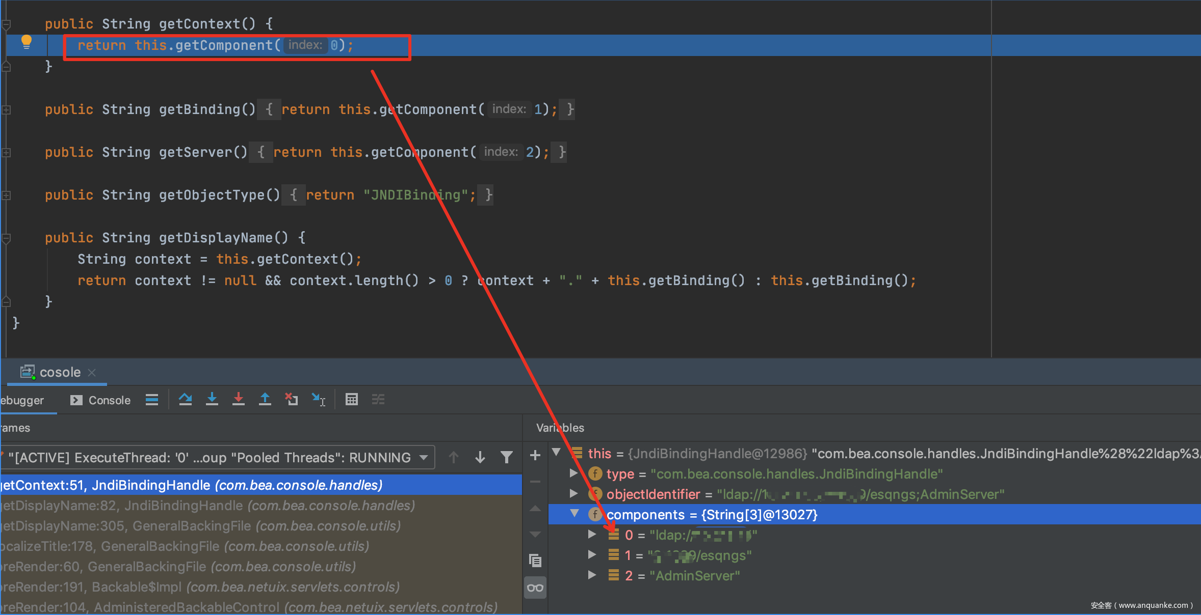 在setComponents(String[] components)可以看到sb 的取值由context, binding,server构成,而在一系列append后,sb的取值最终变成context;binding;server的结构,也就是ldap://x.x.x;x/class;AdminServer
