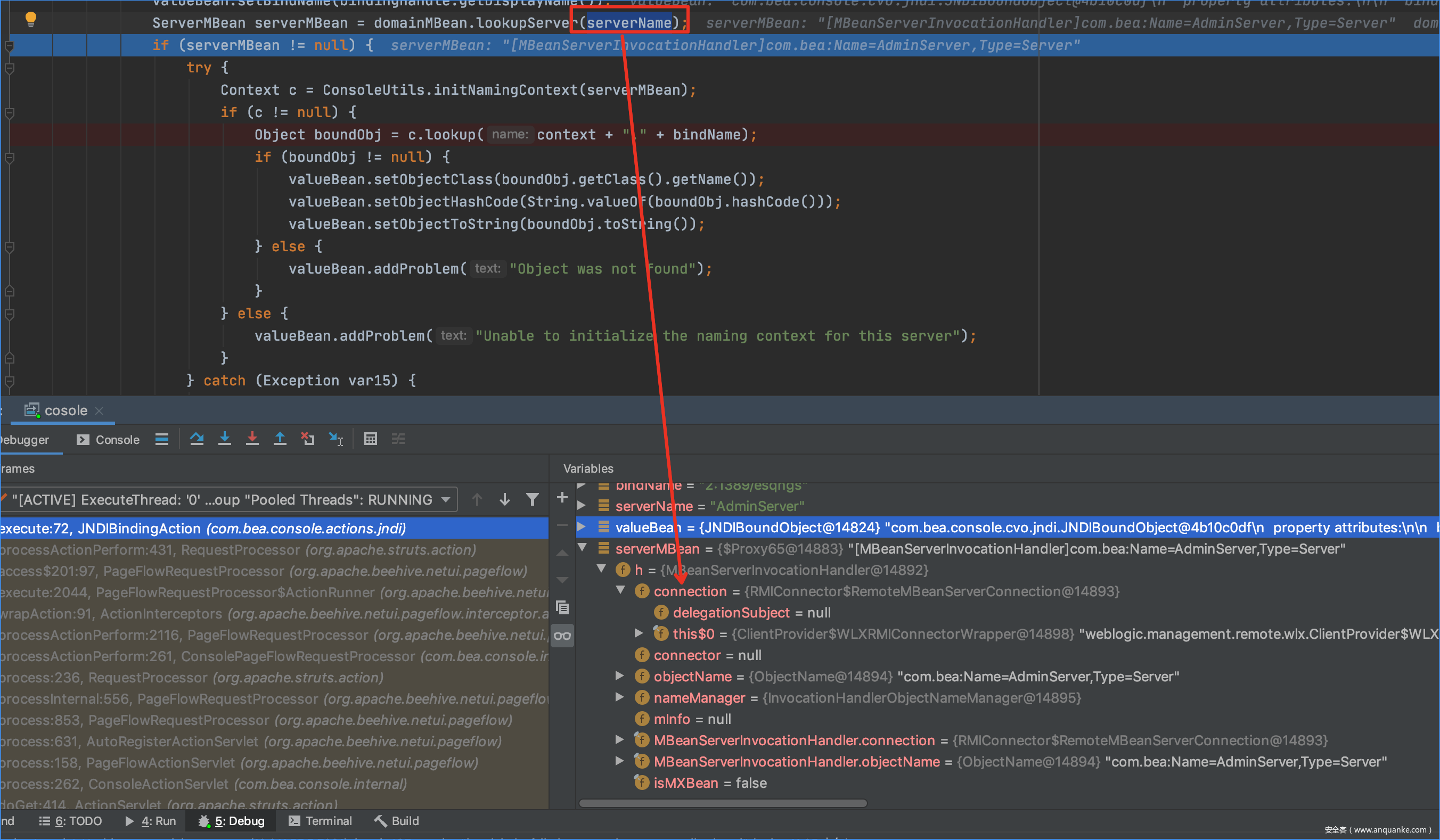 来到JNDIBindingAction.execute的代码,当serverMBean不为空的时候,lookup函数可以被利用。