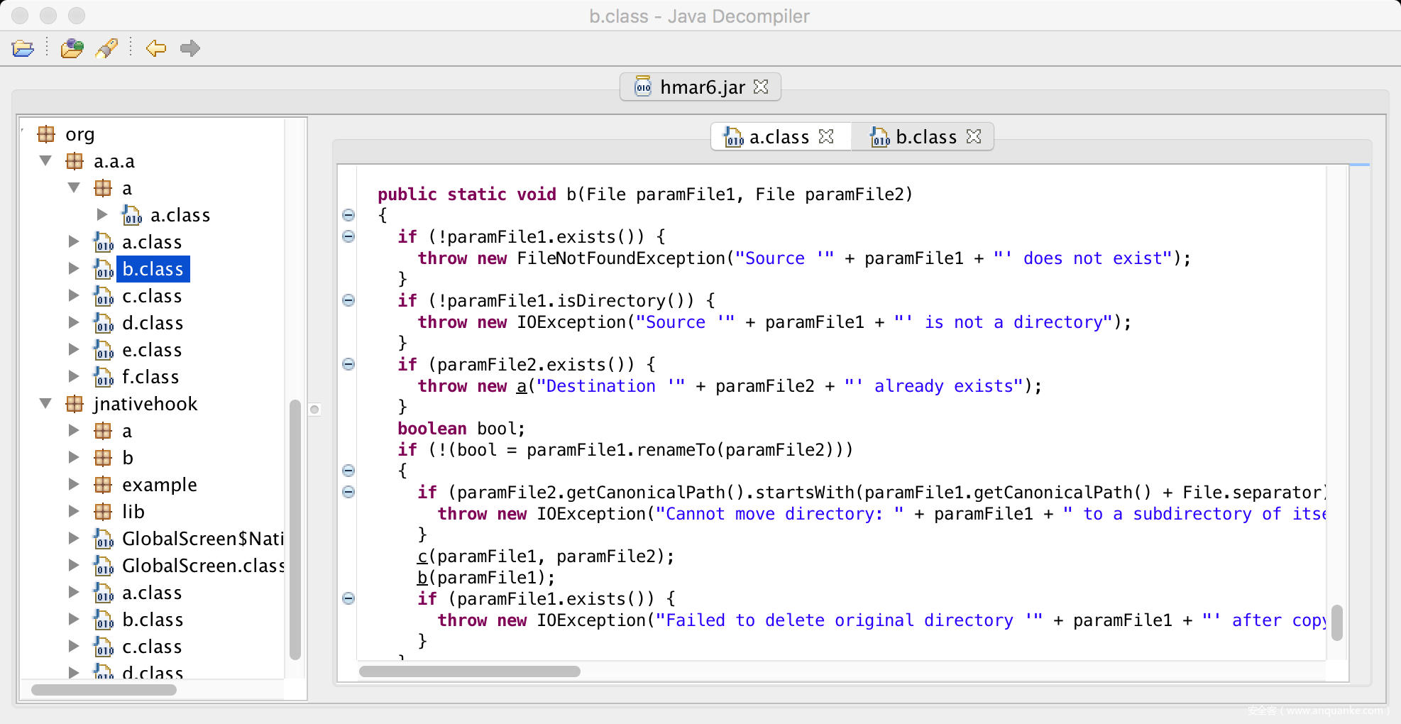 org’数据包中包含了’a.a.a.’和’jnativehook’这两个数据包。通过对’a.a.a’数据包中的多个类文件进行分析之后,我们发现这个数据包中包含的代码主要负责进行文件的I/O操作。比如说,’a.a.a/b.class’中有如下所示的字符串数据: