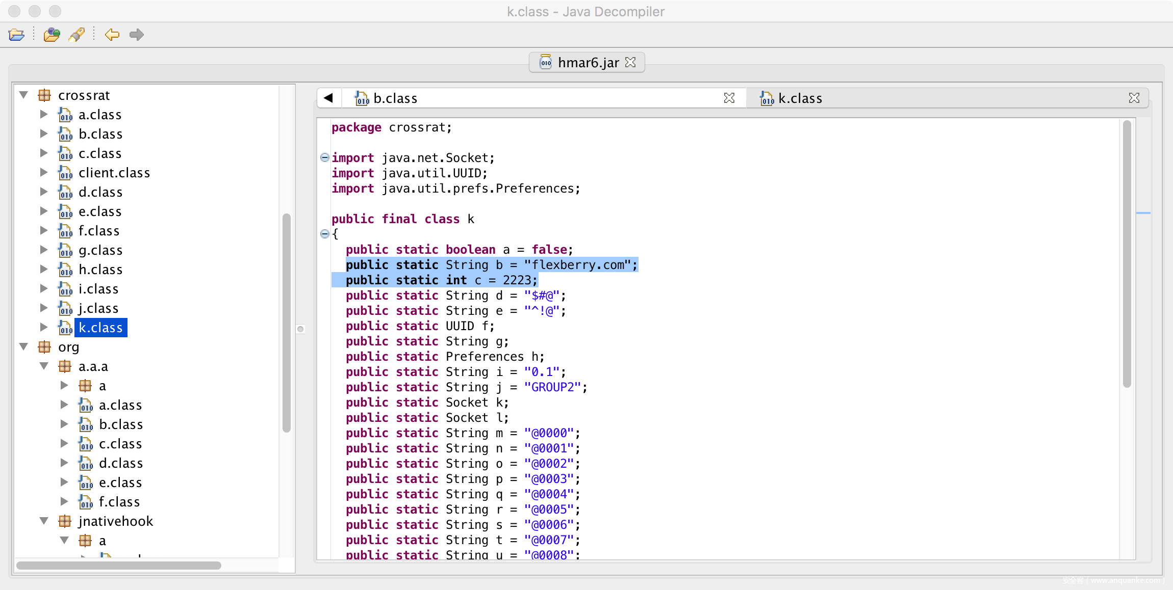 其中,远程C&C服务器的信息是硬编码在crossrat/k.class文件中的: