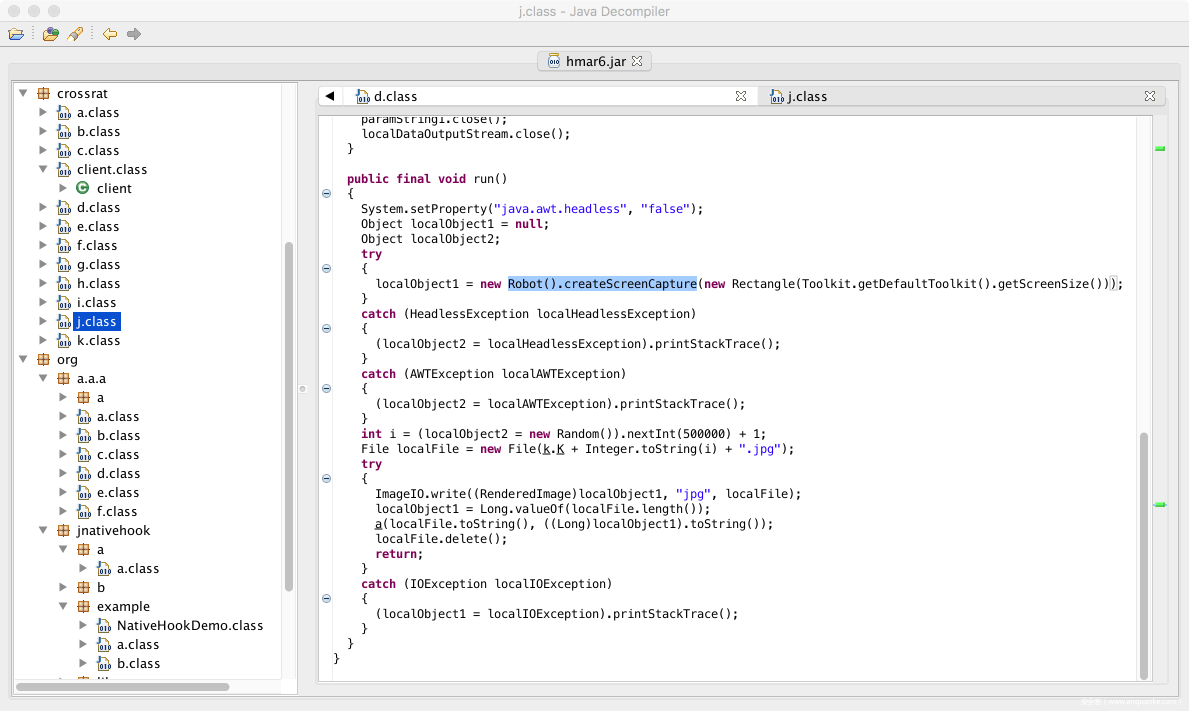 该恶意软件会通过java.awt.Robot().createScreenCapture方法来实现屏幕截图,在将截图文件发送到远程C&C服务器之前,它会把截图文件临时保存在磁盘中(文件名随机,后缀为.jpg)。