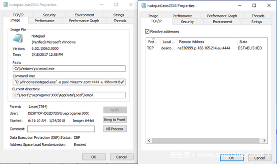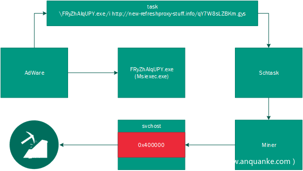 在这种情况下,感染载体是一个PUA模块。 受害者可能只是想下载一个合法的应用程序,但他们却下载了一个带有矿工安装程序的PUA。 该矿工安装程序释放一个随机名称的合法Windows实用工具msiexec,该程序从远程服务器下载并执行恶意模块。 在下一步中,它会安装一个恶意的调度程序任务,从而舍弃矿工这一挖矿主体。 该程序执行合法的系统进程,并使用进程空洞技术(合法进程代码更改为恶意)。 另外,一个特殊的标志,系统关键标志,被设置为这个新的进程。 如果受害者试图终止此进程,则Windows系统将重新启动。 因此,处理这种恶意行为并正确检测威胁的安全解决方案是一个挑战。