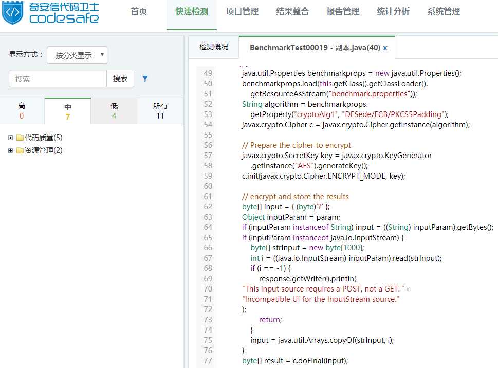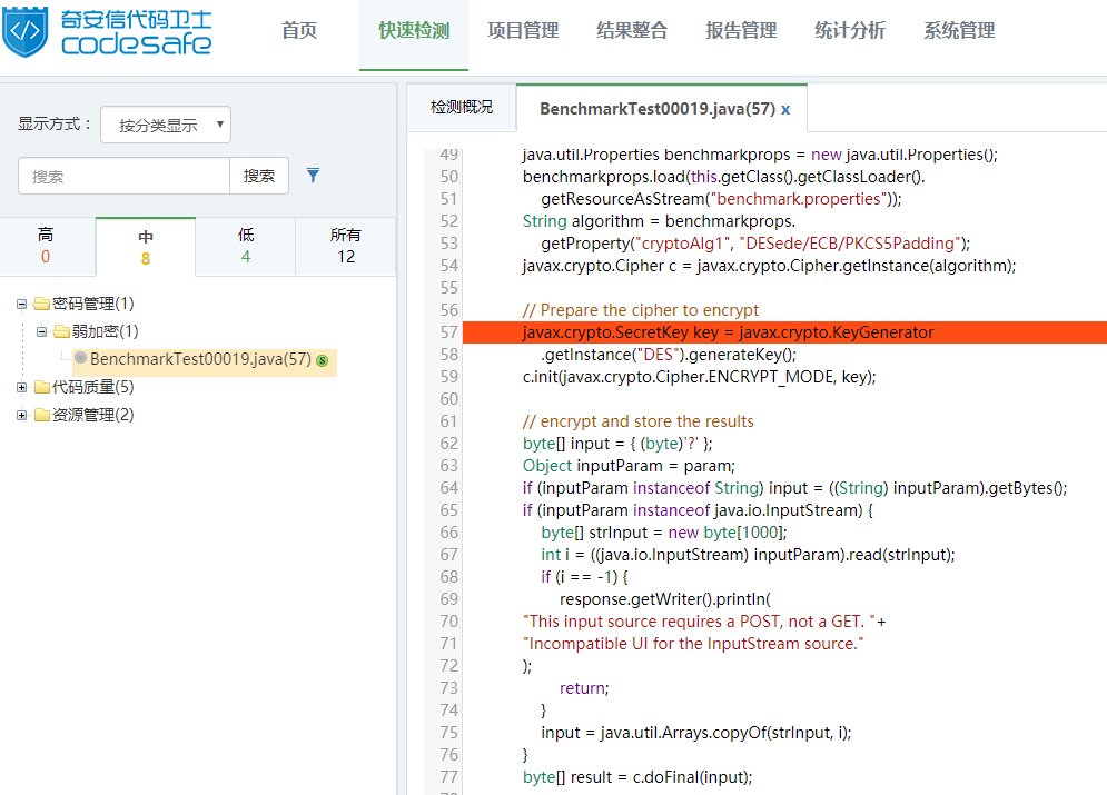 使用代码卫士对上述示例代码进行检测,可以检出“弱加密”缺陷,显示等级为中。在代码行第57行报出缺陷,如图1所示: