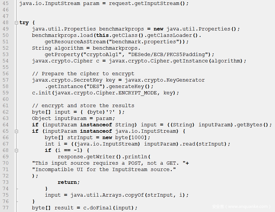 上述示例代码操作是读取请求中的内容并将其加密处理,在第49行获取读取配置文件的实例 benchmarkprops。在第50行加载配置文件,在第52行~53行读取配置文件中的属性 cryptoAlg1,若无此属性默认使用 DESede/ECB/PKCS5Padding 给 algorithm 赋值。第54行将使用 algorithm 作为加密算法构造加密对象c。接下来准备加密的密码。第57~58行实例化了一个DES加密算法的密钥生成器。第59行指定加密对象 c 的操作模式为加密,其中 key 为密钥。第62行~76行对将请求中的输入流转换为字节数组input,在第77行进行对 input 进行加密,加密结果是字节数组 result 。其中使用 DES 算法生成的密钥短,仅有56位,运算速度较慢,而且DES算法完全依赖密钥,易受穷举搜索法攻击。