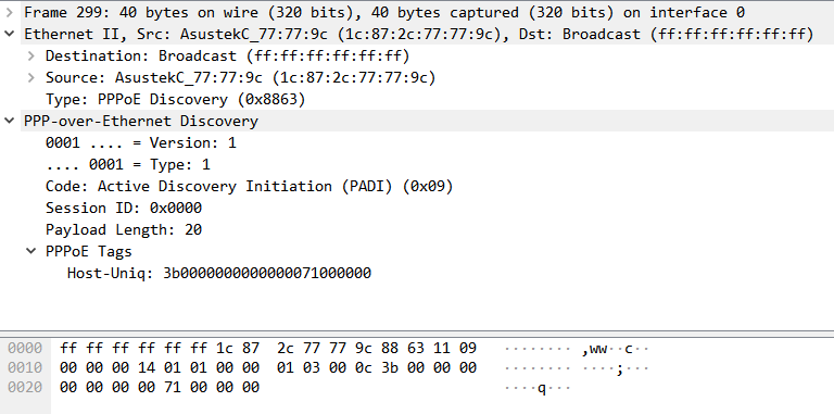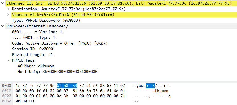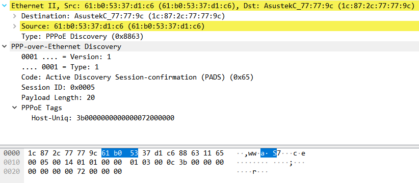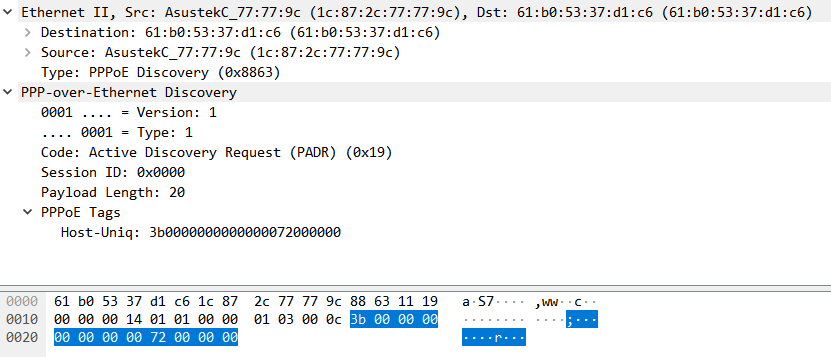并且需要包含前面 PADI 包中的 Host-Uniq 字段,这个字段在 PPPoE 的发现阶段都是必要的。