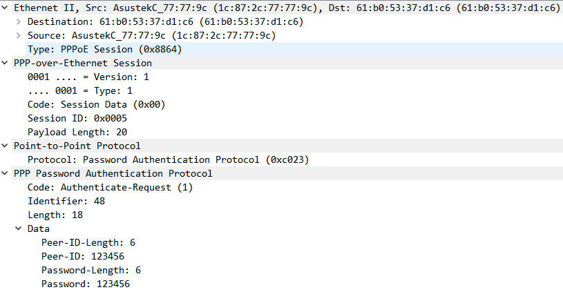 PAP 包的认证方式是由被认证端主动发起,被认证端发送明文口令至认证端,由对方认证。