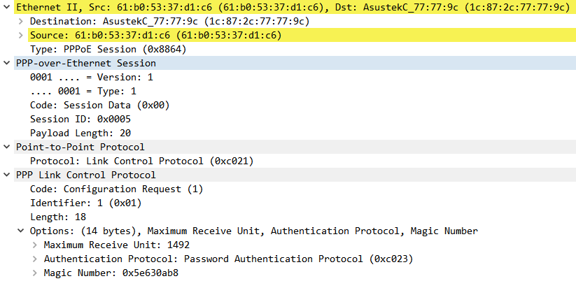 在协商数据链路配置阶段,点对点(PPPoE是点对点协议)双方至少都发了一个 Config-Request 报文,该报文中包含了发送方对于所有的配置参数的期望值。