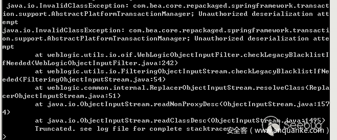 在客户端中,正常调用应该是stub.sendMessage(Message),这个参数应该是Message类对象的,但是我们知道服务端存在一个公共的已知PublicKnown类(比如经典的Apache Common Collection,这里只是用PublicKnown做一个类比),它有readObject方法并且在readObject中存在命令执行的能力,所以我们客户端可以写一个与服务端包名,类名相同的类并继承Message类(Message类在客户端服务端都有的),根据上面两个Tips,在服务端会反序列化传递的数据,然后到达PublicKnown执行命令的地方(这里需要注意的是服务端PublicKnown类的serialVersionUID与客户端的PublicKnown需要保持一致,如果不写在序列化时JVM会自动根据类的属性等生成一个UID,不过有时候自动生成的可能会不一致,不过不一致时,Java RMI服务端会返回错误,提示服务端相应类的serialVersionUID,在本地类重新加上服务端的serialVersionUID就行了):