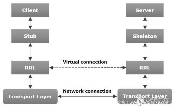 从逻辑上来说,数据是在Client和Server之间横向流动的,但是实际上是从Client到Stub,然后从Skeleton到Server这样纵向流动的: