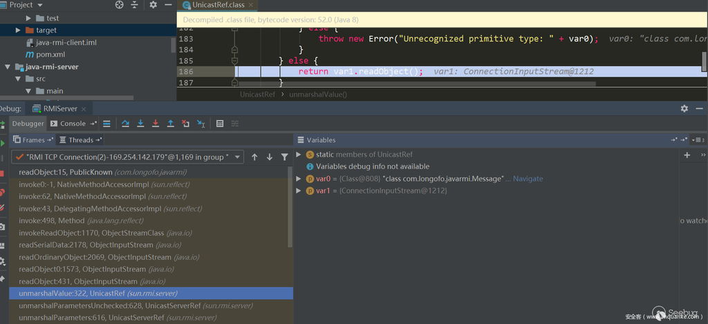 这里还需要注意这时Server端是作为RMI的服务端而成为受害者,在后面的RMI动态类加载或JNDI注入中可以看到Server端也可以作为RMI客户端成为受害者。