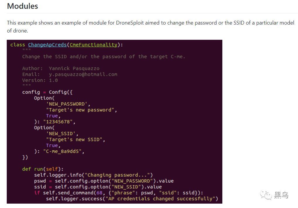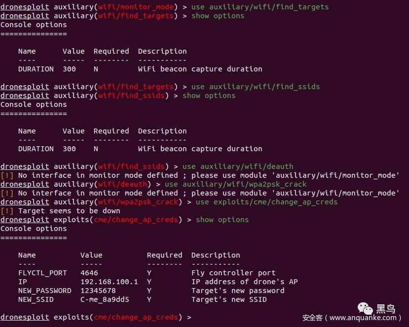 DroneSploit当前支持C-me和Flitt无人机(Hobbico)的模块。其他品牌和型号(包括Parrot和DJI)的新模块正在开发中,并将在不久后添加,大疆厂商要注意啦。