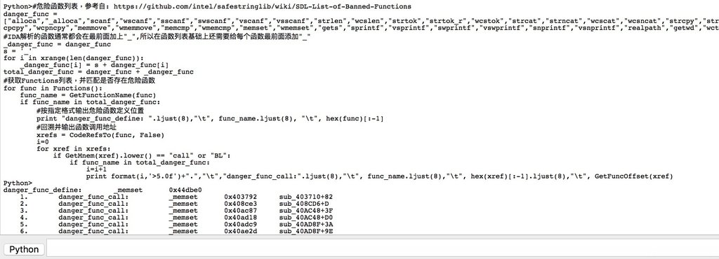 等ida解析完程序后,将上述代码复制到IDA pro的python命令栏中执行即可,效果如下图: 对危险函数的定义位置,和相关调用位置都进行了检测。