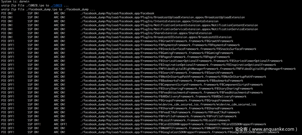 检测方式:判断当前系统是否是macOS,如果是则遍历当前目录,并对所有Mach-O文件执行相应otool指令检测对应选项