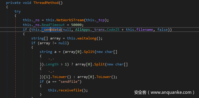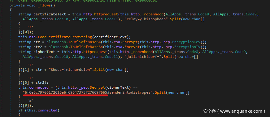 上面的屏幕显示,恶意软件要求提供RSA密钥,该密钥必须通过突出显示的文本进行验证。果检查结果是肯定的,则该恶意软件可以继续执行其恶意操作,例如发送信息:
