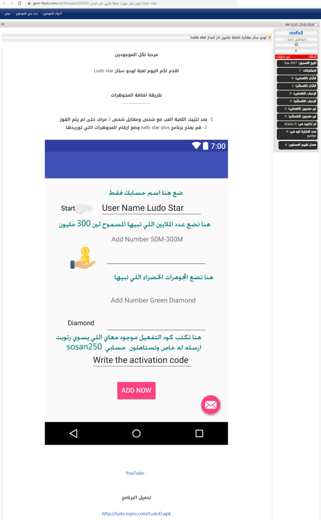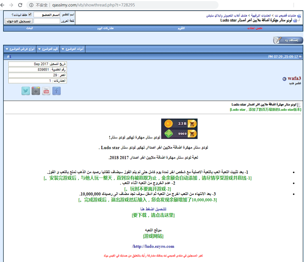 - 在Gem-Flash网站进行发布虚假游戏信息,诱导用户进行恶意载荷的下载。攻击者(“wafa3”)应该和Qassimy上发布的为同一个,此次钓鱼信息里还带有指向YouTube的一个引链。