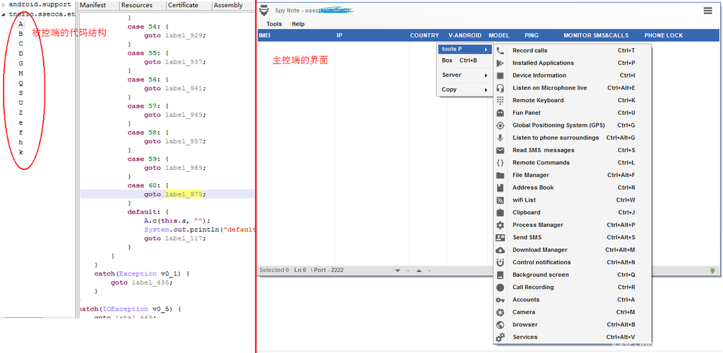 图5.3 SpyNote被控端代码结构(左)和控制端管理界面(右)