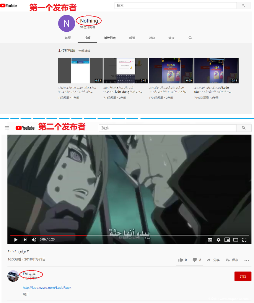 图3.4 两个攻击者在YouTube平台上发布的钓鱼信息