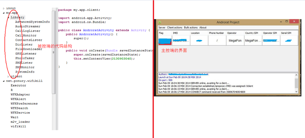 图5.1 Androrat被控端代码结构(左)和控制端管理界面(右)