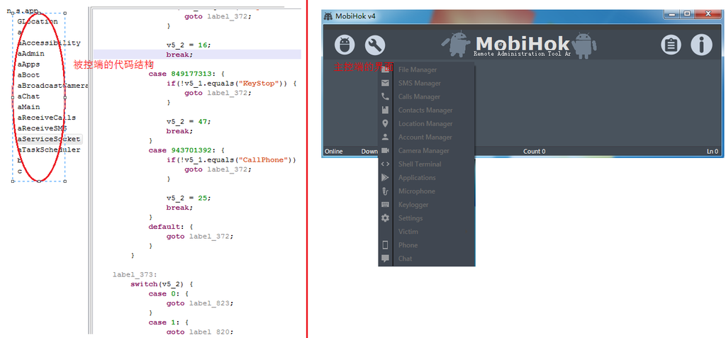 图5.4 MobiHok被控端代码结构(左)和控制端管理界面(右)