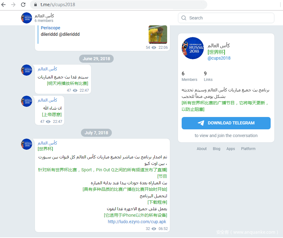 - Telegram上伪装成2018世界杯直播的群频道。