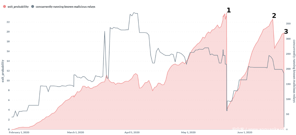 图3:ContactInfo确认的恶意Tor出口中继器数。Nuseu图表(原始数据源:https://metrics.torproject.org/oninoo.html)
