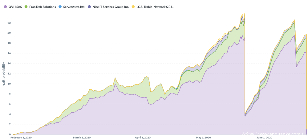 恶意中继器分析的一个关键问题是:他们使用了哪些host服务公司?所以有一个根据互联网服务提供商的分类方式。它主要是OVH(一般来说,它是Tor中继器使用的最大的ISP之一)。Frantech、ServerAstra和Trabia Network也是这个领域相当常见的中继器提供商。“Nice IT Services Group”是一个很有趣的存在,因为2020年4月16日,在犯罪集团在这个鲜为人知的网络上部署了一些中继器,在此之前我从来没在这里见过中继器。