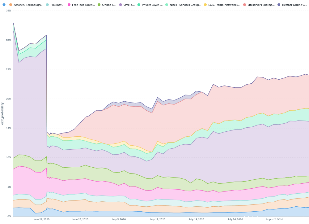 图7:自自治系统上次移除恶意出口中继器(2020年6月21日)以来未知运营商的出口中继器占用率(仅显示ASN>0.5%的出口中继器占比)。两个网络正在显著增长:OVH(第二次出现)和Liteserver Holding。Nuseu图表(原始数据源:https://metrics.torproject.org/oninoo.html)