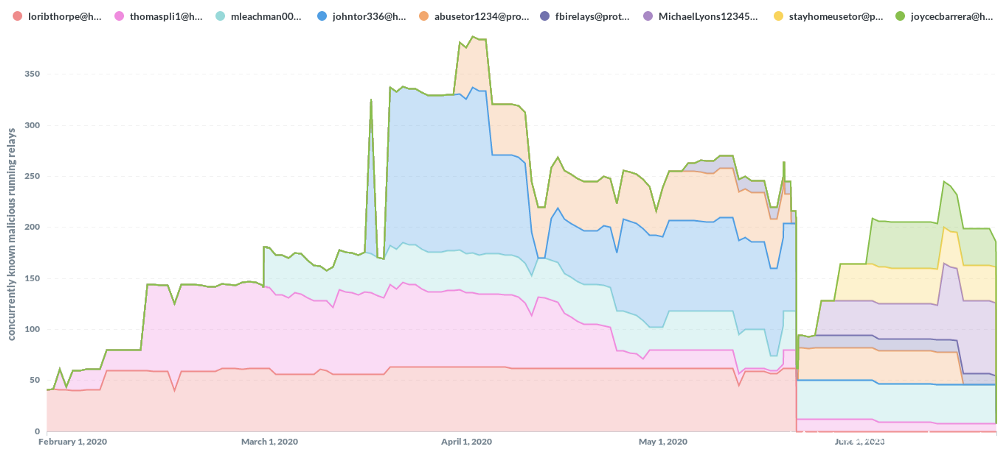 除此之外,Tor目录管理机构显然不再移除他们自2020年6月26日以来一直移除的恶意中继器。目前尚不清楚是什么导致了这一政策变化,但显然有人乐见其成,并持续添加未声明的中继器组(以前由于缺少联系人信息和MyFamily而被移除)。