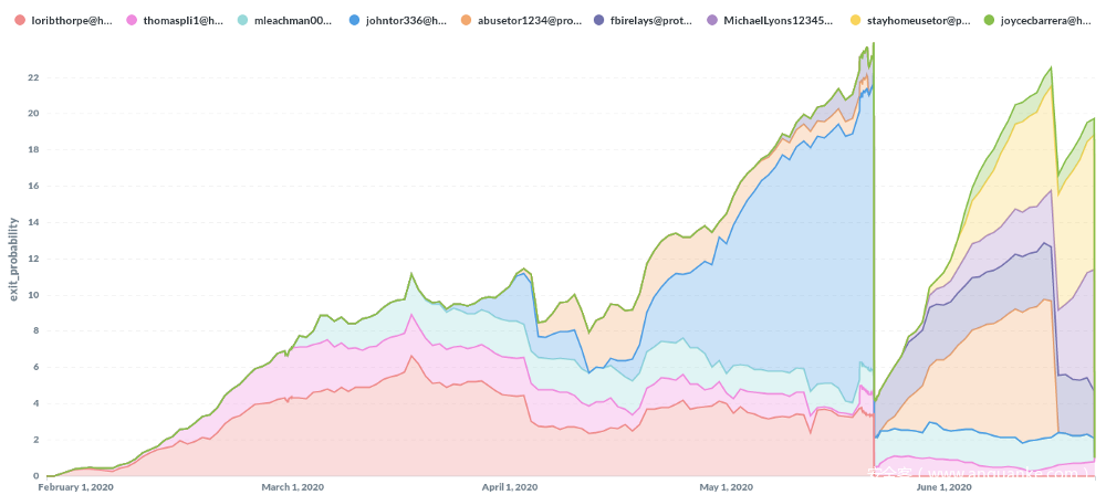 图8:自上次移除恶意出口中继器(2020-06-21)以来未知运营者的出口中继器所占比例,按出口中继器联系人信息(累计)分组。仅显示出口中继器占比大于0.5%的联系人信息。不包括没有联系人信息的出口中继器。Nuseu图表(原始数据源:https://metrics.to